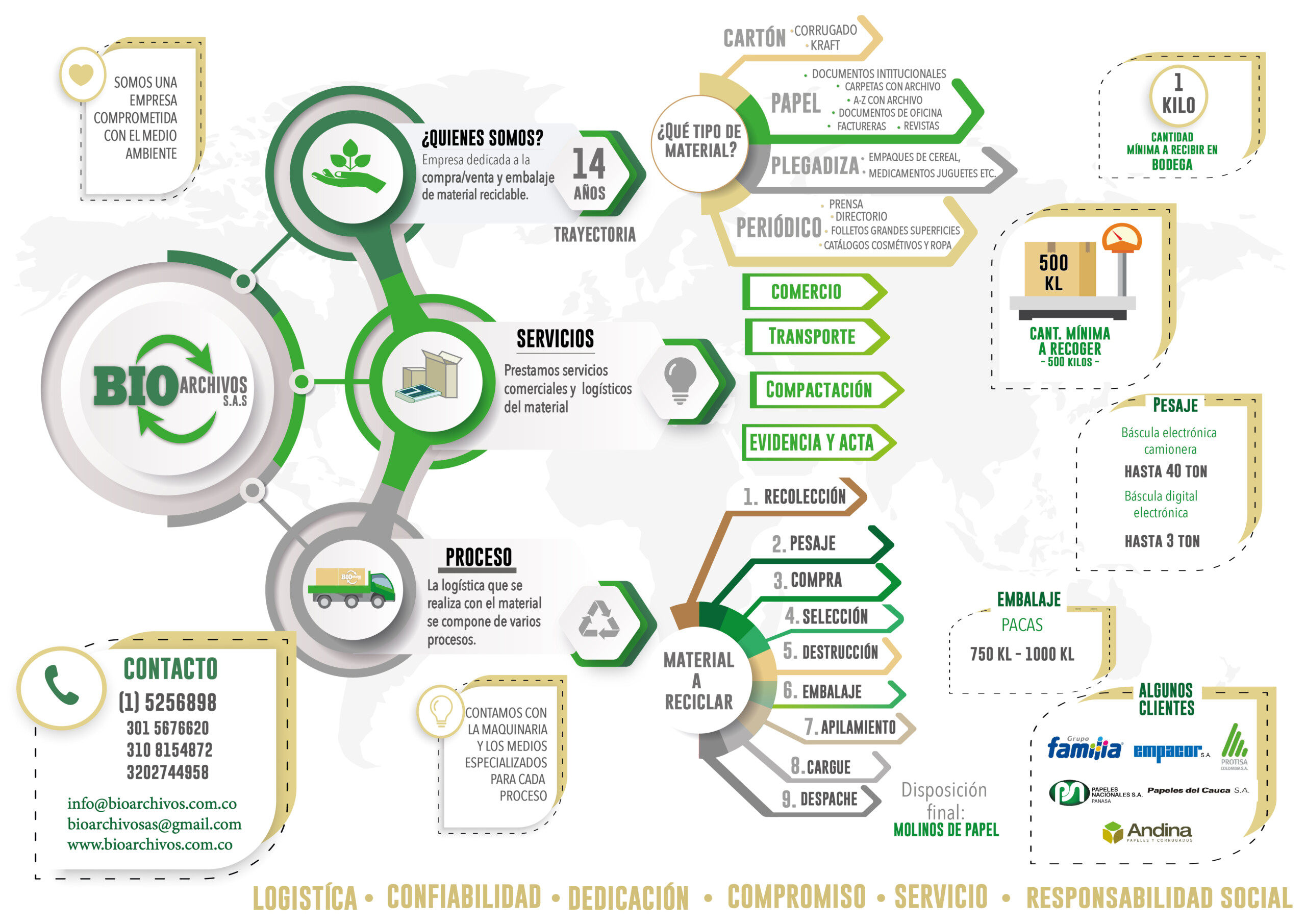 Con el paso de los años han incorporado nuevas líneas de producto con el objetivo de proveer a sus clientes potenciales, los cuales son grandes filiales, un mayor número de materiales reciclados y compactados capaces de transformarse en nuevos productos. La actividad que realiza la compañía es la compra de cartón y papel reciclado en diferentes tipos de materiales, para luego ser seleccionado y compactado a través de modernas máquinas, con el objetivo de entregar al por mayor el material compactado. De esta forma, los productos son vendidos a grandes papeleras nacionales tal como PRODUCTOS FAMILIA S.A, PAPELES DEL CAUCA S.A, PAPELES Y CORRUGADOS ANDINA, PROTISA COLOMBIA ENTRE OTROS que son encargadas de transformarlas en productos higiénicos o cartón.